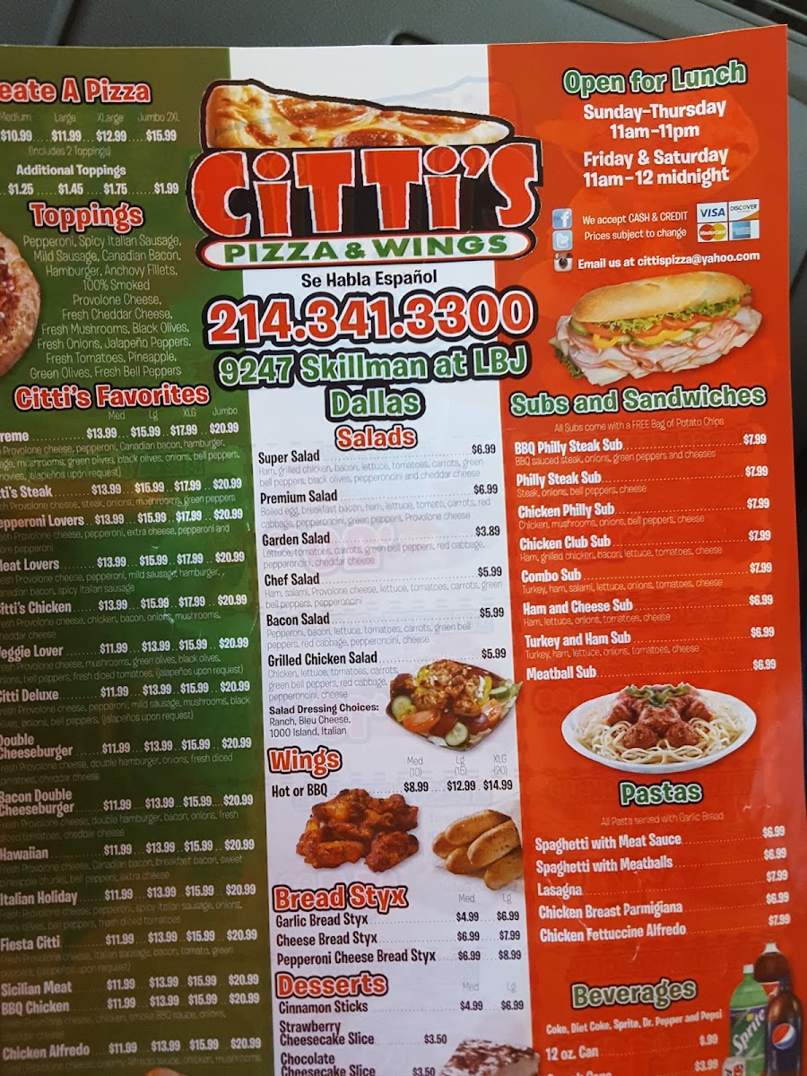 Welcome to Citti's Pizza Skillman Street, a gem located in the heart of Dallas at 9247 Skillman St #104. This inviting establishment invites you to indulge in a delightful array of pizzas and appetizers. The standout Italian Holiday pizza has earned rave reviews for its exquisite flavor, while the hot wings have impressed patrons with their fiery kick.
